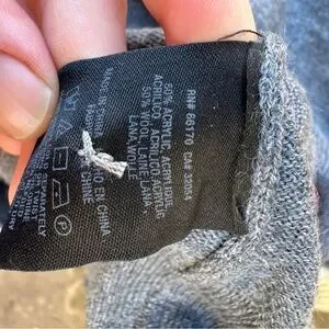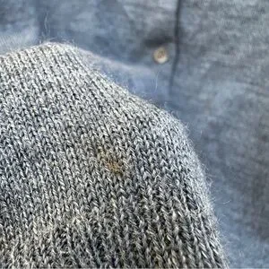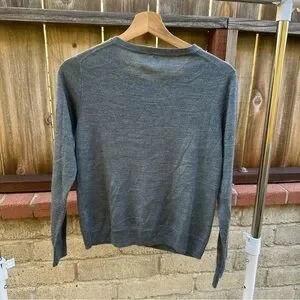Good pre-owned condition. There is one small stain (see close-up photo). The stain does not affect the structure, wearability, or function of the sweater and may improve with additional cleaning. No holes or major flaws noted.