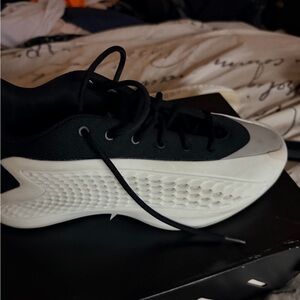 Navy high-top sneakers with red stripe detail. Sleek design with textured finish. Ideal for casual wear.