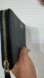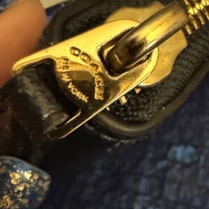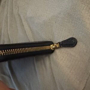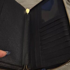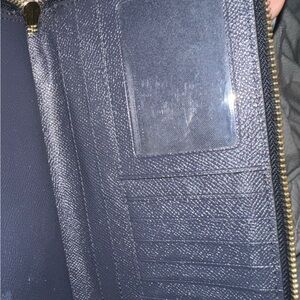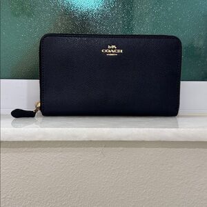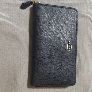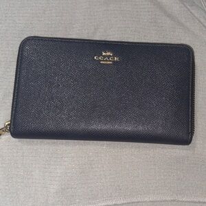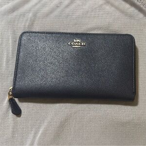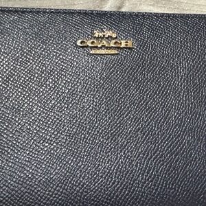 Sleek dark blue leather wallet by Coach. Features zip-around design and iconic logo detail.