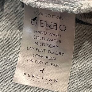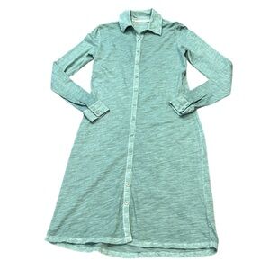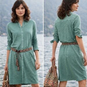 Peruvian Connection Lagos dress, sage green, in gently preloved condition. Mild signs of typical washing wear and one minor/tiny flaw on lower back area of dress, it’s either a fabric flaw or material is a little thinner in that area (see photos, close up and further away). Dress has a vintage style coloring. Long sleeves, collar, button up front. Add a fun belt, like the model in the photo to add a pop of color (belt not included). Approximate measurements: length 41”, 17.5” pit to pit laying flat, waistline 15.5” laying flat, hips 18” laying flat. 100% cotton.