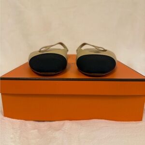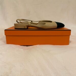 Good condition Chanel slingback flats with a beige body and black toe. Signs of wear on soles of shoes and on leather and cap toe of shoes. Comes with dust bags!