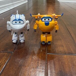 Delight your child with this fun airplane toy set. Featuring a white and orange design, these toys are perfect for imaginative play. Ideal for young aviation enthusiasts.