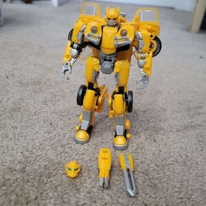 The 18th figure released in Hasbro's transformers toyline known as: Studio Series (SS). This toyline started in 2018 as a Commemorative of the 10+ year anniversaries of the live action movies and is still ongoing. It's aim has been to make updated, more screen accurate figures to the characters from the movies. This one is for the appearance of Bumblebee from his own stand alone movie. The figure in question comes with a multitude of accessories including an optional battlemask face, a swappable gun emplacement for his right arm, and a detachable blade for either arm. The blade accessory in question is missing one of its 2 locking tabs, but still attaches to either arm relatively securely. All accessories can be stored on the figure in both robot and vehicle mode and don't hinder either modes functionality.