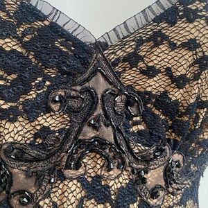 Gorgeous black lace midi dress with black beads detailing,adjustable straps,very “stretchy “ fabric.Great condition,no issues,no damage. Smoke free home.Please message me in Comments if you have any questions. Length from the center ( between breast )to the bottom/hem is about 36”-see pics. B21. DB.