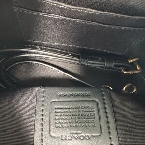 Chic Coach shoulder bag with signature pattern. Black leather with gold chain accents. Stylish and versatile.