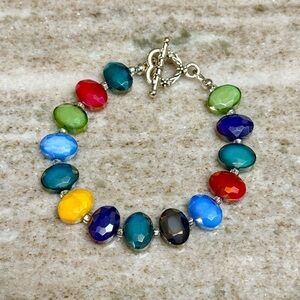 Add a splash of color to your outfit with this vibrant multicolor bracelet featuring electroplated faceted flat oval glass beads with exquisite heart shaped Tibetan silver toggle clasp.