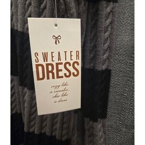 Keywords: sweater dress, hooded dress, cable knit, striped dress, black and gray dress, cozy dress, comfy dress, casual dress, knit dress, J For Justify, oversized dress, one size dress, long sleeve dress, winter dress, fall dress