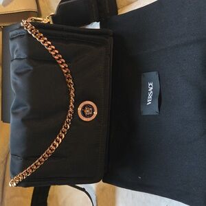 Chic black crossbody bag with a bold gold chain accent. Iconic Medusa emblem adds luxury. Brand new with no call outs.