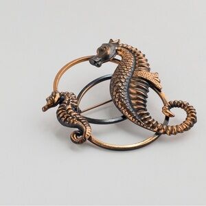 Modern vintage large copper seahorse brooch pin lapel featuring a mother and her baby. Copper jewelry. Unmarked, pre-owned with normal vintage wear such as light surface scratches, not noticeable. Please refer to photos.