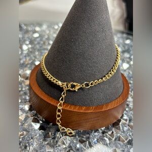 Stylish CHANEL bracelet with a gold chain and green charm. Adds luxury to any look.
