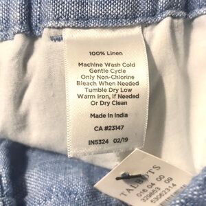 Talbots linen chambray pants are NWT. Easy pull-on styling with and elasticized and drawstring waist and fuller leg. Pants are a beautiful shade of blue, are lightweight and comfortable and can be dressed up for work or dressed down for a casual day out. A great vacation staple! Note that the color in some of my photos is a little off. The color of these pants matches the stock pics and pants measure 14.5” across waist (plus stretch), 9.5” rise and 32” inseam. Smoke free home.