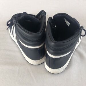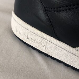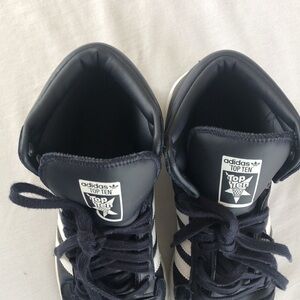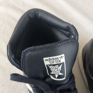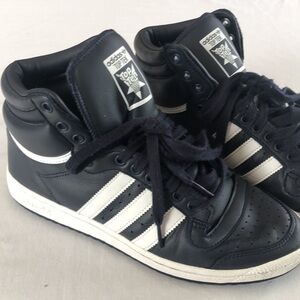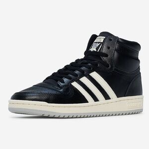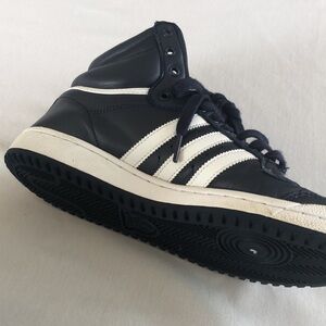Back in the '80s, Top Tens were only found on the feet of B-ball's hottest players. Now anyone can wear them any day, anywhere. Even though the game has moved off the hardwood, the premium leather, mid top stance and indomitable attitude of these adidas shoes are exactly the same. Made in part with recycled content generated from production waste, e.g., cutting scraps and post-consumer household waste, to avoid the larger environmental impact of producing virgin content. Sneakers are in used condition with minor wear.