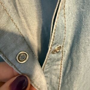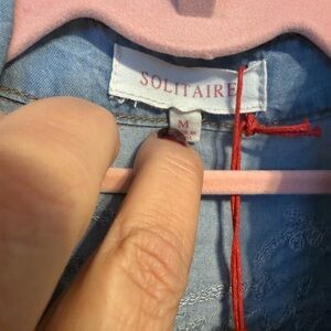 Stylish blue button down shirt. Features elegant white embroidery. Perfect for casual or dressy occasions. Much prettier in person than the pictures can show. This is brand new with tags never been worn in excellent condition. 23 inches length, with its slightly longer in the back, 21 inches pit to pit, 25 inches sleeves. These are snap closures. Really unique look and very pretty. Smoke free home. Pet friendly, but stored away from pets.