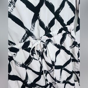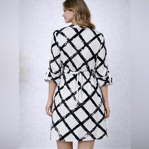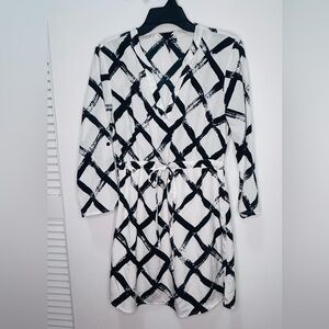 Stylish black and white geometric dress with a tie waist. Perfect for any occasion.