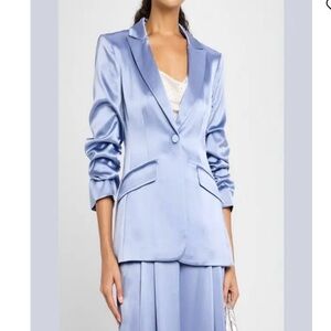 Ruched sleeves add to the retro-chic vibes of a one-button blazer shaped from smooth, shiny satin.