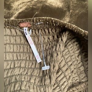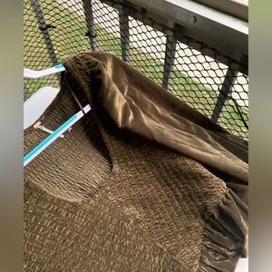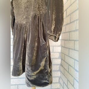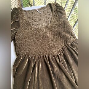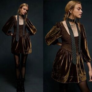 Free People Farrier Velvet Mini Dress Brown Bear Balloon Sleeves Smocked Bodice