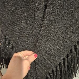 This classic black wrap features a triangular silhouette with long fringe trim, designed to drape effortlessly over the shoulders as a shawl, wrap, or poncho-style layer.