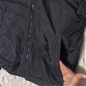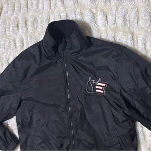 This jacket is a sporty, retro-style zip-up with a black base color and a bold red stripe running across the chest and upper arms.