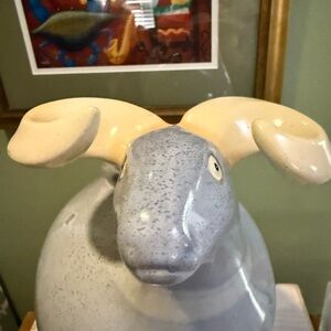 It features a unique, stylized animal design with a light gray speckled glaze.