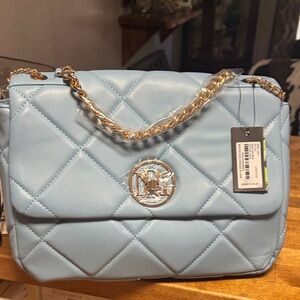 Elegant white knit hat. Features a gold logo accent. Perfect for winter style.