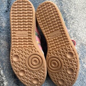 Stylish adidas sneakers with floral pattern. Pink laces and stripes. Comfortable and trendy.
