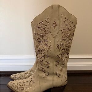 Step out in style with these embellished cream western boots. Perfect for adding a touch of elegance to any outfit. Worn once