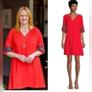 The Pioneer Woman Red Dress with Embroidered Sleeves