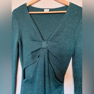 This Abercrombie & Fitch ribbed sweater dress is the perfect blend of cozy and chic. Featuring flirty front cutouts and a body-hugging silhouette, this long-sleeve mini is made to move from day to night effortlessly. The stretch-knit fabric hugs you in all the right places, while the deep V neckline and front knot add major style points. Size LT green color