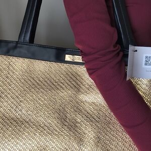 Versatile Versace Parfums tote featuring a natural woven straw body with sleek black faux leather trim and double handles. Accented with a gold-tone Versace Parfums logo plate on the front.