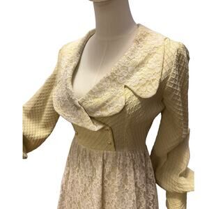 Step into Regency-era romance with this ethereal cream/ yellow lace gown, reminiscent of the styles seen in Bridgerton. Features a wide lace-trimmed collar, pearl button accents, sheer puff sleeves with dramatic cuffs, and a flowing full-length lace skirt. The back keyhole tie adds a delicate, feminine finish. Unbranded vintage piece with handmade detail and a graceful silhouette perfect for photoshoots, weddings, or romantic occasions