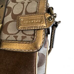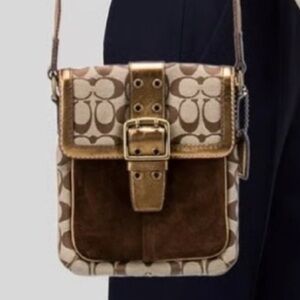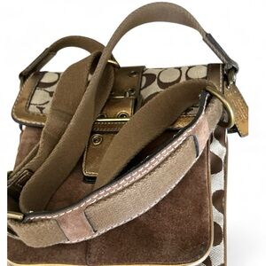 Coach Legacy Suede Signature Canvas Bronze Brown Buckle Flap Crossbody Bag 7x8x1