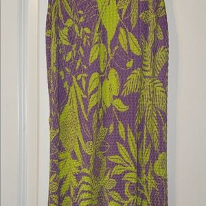 Vibrant midi dress by FARM Rio. Features a striking purple and green pattern. Sleeveless design with a relaxed fit.