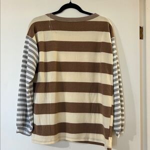 Stylish long sleeve top with bold brown and cream stripes. Features a unique pocket with gray and white stripes.