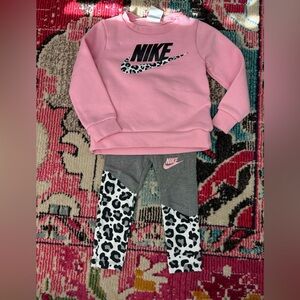 Cozy pink Nike sweatshirt. Gray leggings with bold leopard print. Stylish and comfortable for active kids. Worn once like new. Smoke and pet free home.