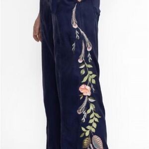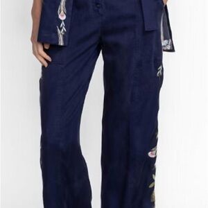 Johnny Was Emike Belted wide leg Navy Pants with Floral Embroidery NWOT