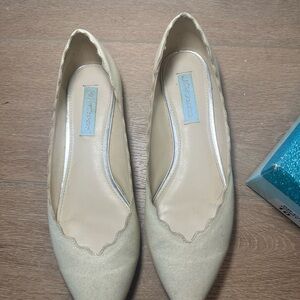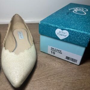 Betsey Johnson SB-Cake ivory glitter pointed-toe flats in women’s size 10, worn once for a wedding and stored in the original box. Soft shimmering fabric upper with scalloped edges and a sleek pointed silhouette — elegant, feminine, and perfect for bridal, formal events, receptions, or special occasions.