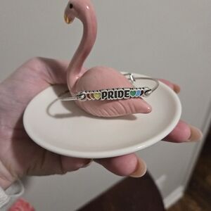 Silver Alex and Ani bracelet featuring 'Pride' with rainbow heart accents. Perfect for adding a touch of color and meaning to any outfit.