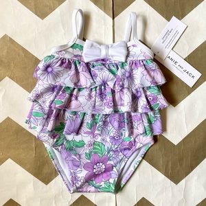 Light purple white and mint green floral print ruffle baby swimsuit. Tiered ruffles covering the body and a bow on the front. New with tags. Perfect with a pair of sunglasses from my closet.