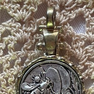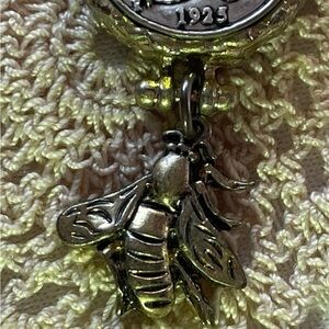 Vintage genuine 1925 kingdom of Italy, 10 centesimi Elegant gold bee pendant. The coin depicts a honeybee foraging on a flower and was minted during the reign of King Vittorio Emmanuel III. The bee on the flower, symbolizes industry & hard work. The original coin is typically copper surrounded by a setting of attached bee charm, which appears to be a different metal possibly brass or silver toned, which is common in up cycling coin jewelry. The item is a piece of handmade vintage style jewelry converting a historical coin into a wearable charm or necklace. 2.5” length. The coin piece is 1” diameter. In mint condition. Smoke & pet free home.