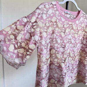 Zara Pink Lace Mesh Floral Cropped Boxy Short Sleeve Top Size S
