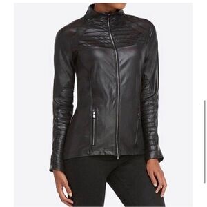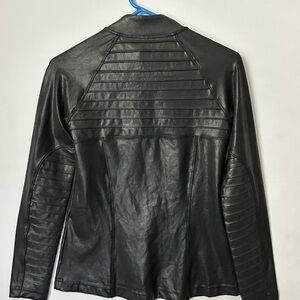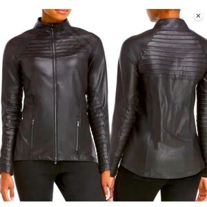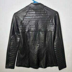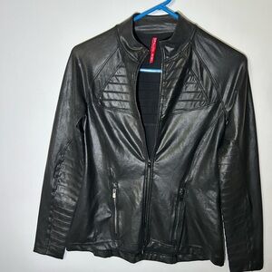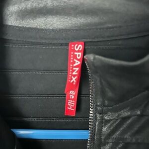 Spanx "Faux Leather Moto Jacket" in Very Black, size S. Sold out everywhere! Spanx description: "This must-have style is detailed with slimming moto accents, figure-flattering seams, and front-zip pockets for easy storage. High-gloss, faux leather fabric offers great comfort and flexibility."