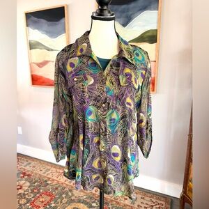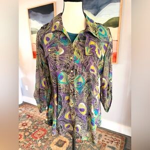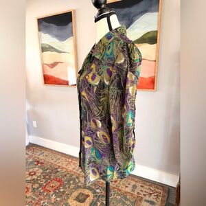 Gorgeous vintage Sarah Michelle sheer polyester blouse featuring an absolutely beautiful peacock-inspired print in rich purples, teals, black, and gold. This semi-sheer to sheer top is lightweight, flowy, and incredibly eye-catching, finished with gold-tone buttons on the front, pockets, and sleeves for an elevated touch.