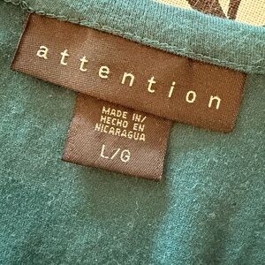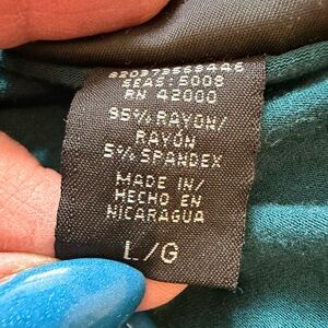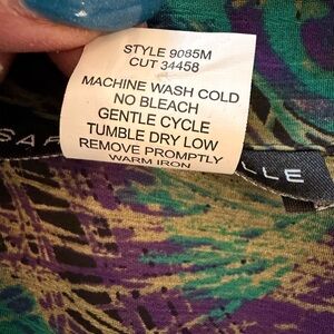 Included with the blouse is a coordinating teal T-shirt (size Large) that perfectly matches the tones in the print — making this a ready-to-wear layered set. The tee is super stretchy and soft, and looks amazing worn underneath the sheer blouse. Both pieces are in really great pre-loved condition with no stains, holes, or tears.