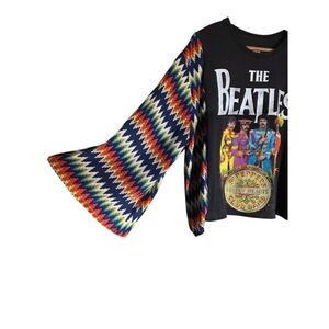 Graphic tee featuring The Beatles with vibrant zigzag sleeves. Perfect for music lovers.