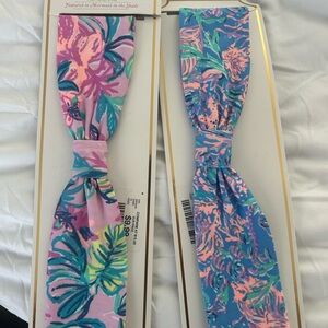 Pair of Lilly Pulitzer headbands. Features vibrant pink and blue tropical patterns.
