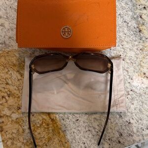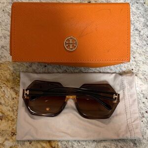 Stylish Tory Burch sunglasses with a unique hexagonal brown frame. Comes with a bold orange case. Perfect for adding flair to any outfit.