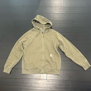 Moss/Olive green hoodie with a full zip. Features front pockets and Carhartt logo patch. Size M. There is a tiny hole on one sleeve but it doesn’t go completely through fabric, see photo. Smoke free pet free home. No stains