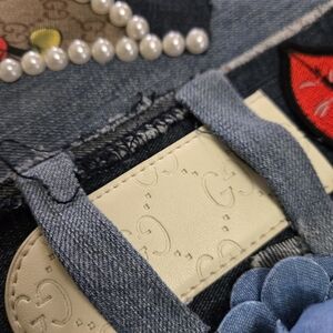 Unique denim patchwork clutch featuring floral and lip embellishments. Accented with pearls and a motivational patch.