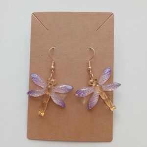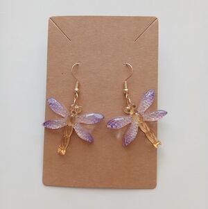 Elegant dragonfly earrings. Features purple and gold tones. Perfect for any occasion.