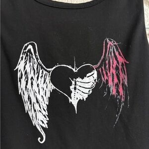Chic black crop top with a bold winged heart graphic. Ideal for casual or night outings. Adds edgy flair to your look.